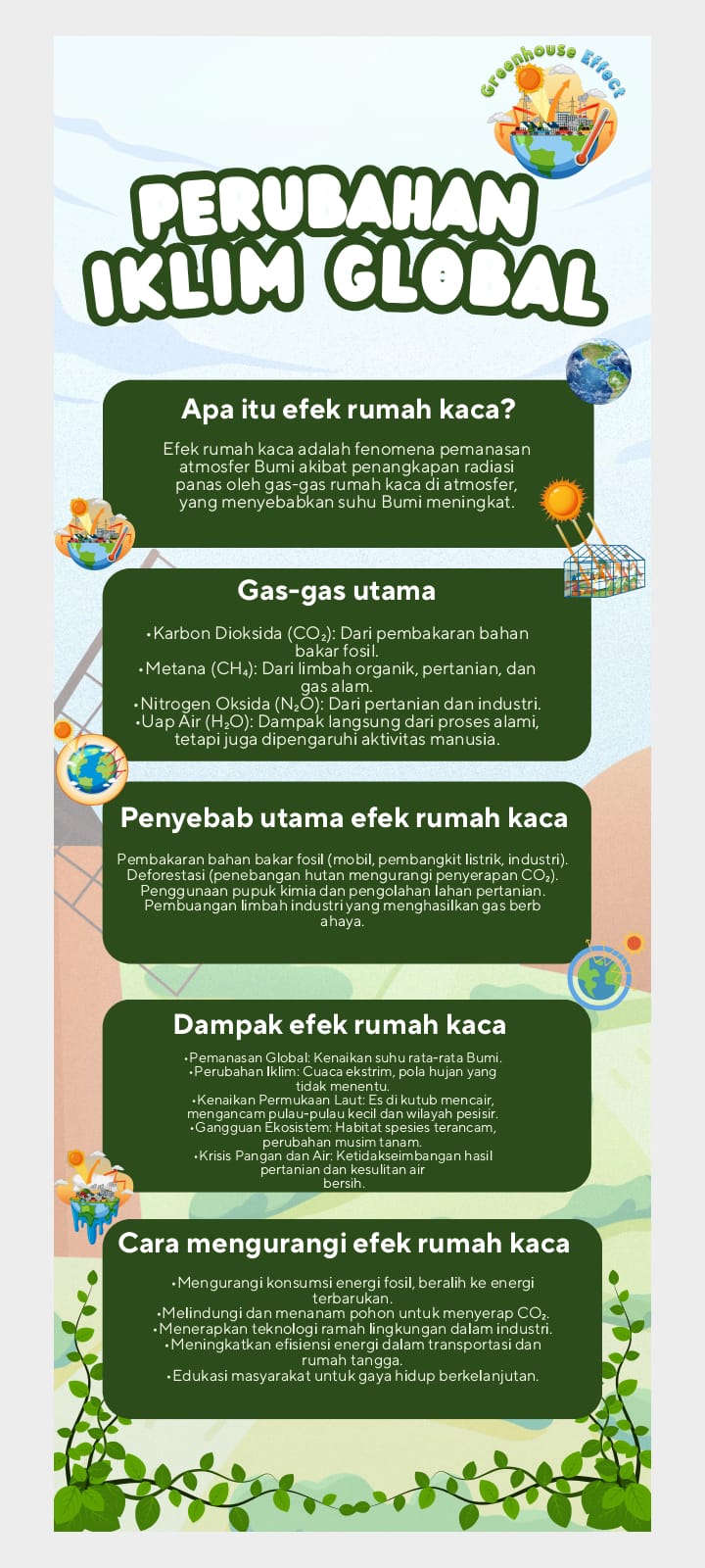 Deskripsi : Infografis ini menggambarkan ancaman perubahan iklim global akibat efek rumah kaca, dengan visualisasi bumi yang terganggu dan pesan yang kuat. Infografis ini mengajak masyarakat untuk peduli dan bertindak mengurangi emisi gas rumah kaca, menghemat energi, dan mendukung praktik ramah lingkungan untuk mengurangi dampak perubahan iklim dan menciptakan masa depan yang lebih berkelanjutan.