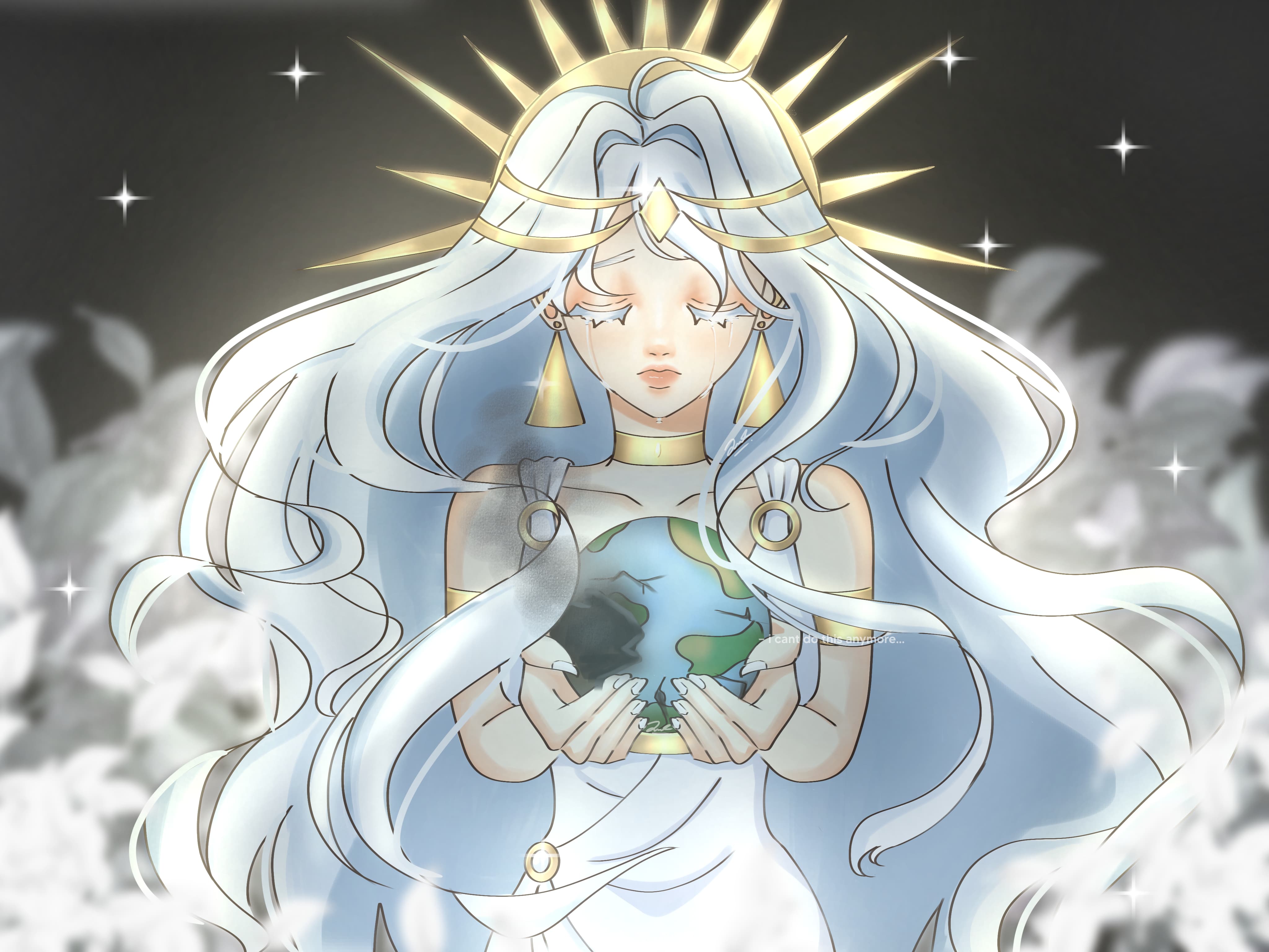 Deskripsi : Sang Dewi dengan kecewa memegangi bumi yang rusak, kecewa karena manusia telah merusaknya. Bumi seolah berbisik, meminta kita untuk merawatnya sebelum semuanya terlambat