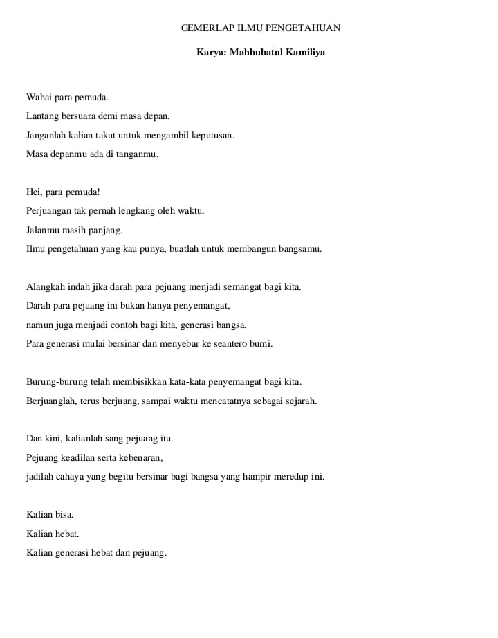 DESKRIPSI:Puisi ini saya tulis untuk menggambarkan perjuangan para pahlawan dalam merebut kemerdekaan. Namun, saya mempertanyakan: mengapa kini justru terasa seperti dijajah oleh bangsa sendiri? Ilmu pengetahuan yang tak diutamakan bisa membawa pada kesalahan yang nyata, namun sering kali kita memilih menutup mata dan telinga, seolah tak ingin melihat dan mendengarnya.