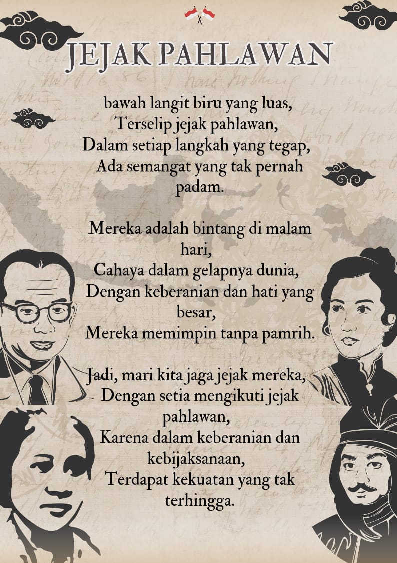Deskripsi: "Jejak Pahlawan" adalah mengenang jasa dan pengorbanan pahlawan yang telah berjuang untuk kemerdekaan dan kebaikan, serta menginspirasi generasi muda untuk mengikuti jejak mereka dan melakukan perbuatan yang baik dan berani.