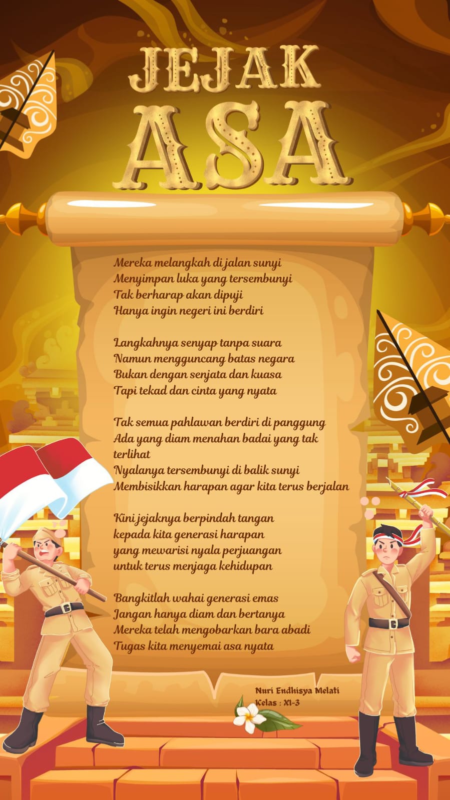 Deskripsi : Puisi ini menggambarkan sosok-sosok pejuang yang tak selalu tampak di sorotan, namun meninggalkan jejak penuh makna bagi generasi setelahnya. Dalam diam mereka berkorban, dalam sunyi mereka menyalakan harapan. “Jejak Asa” mengajak kita,generasi masa kini untuk tidak hanya mengenang, tetapi melanjutkan perjuangan itu lewat karya, semangat, dan suara menjadi pengingat bagi kita untuk selalu meneruskan perjuangannya