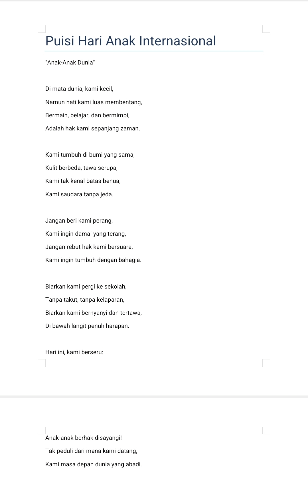 Deskripsi: Puisi ini menggambarkan suara dan harapan anak-anak dari seluruh dunia. Melalui bait-bait yang penuh empati dan kepolosan, anak-anak menyuarakan hak-hak mereka untuk hidup dalam damai, mendapatkan pendidikan, bermain, dan tumbuh dengan bahagia tanpa rasa takut atau diskriminasi. Dengan semangat persatuan, puisi ini menekankan bahwa meskipun berbeda warna kulit dan asal, semua anak adalah saudara dan masa depan dunia. Puisi ini mengajak pembaca untuk lebih peduli, melindungi, dan menghargai setiap anak sebagai anugerah yang tak ternilai.