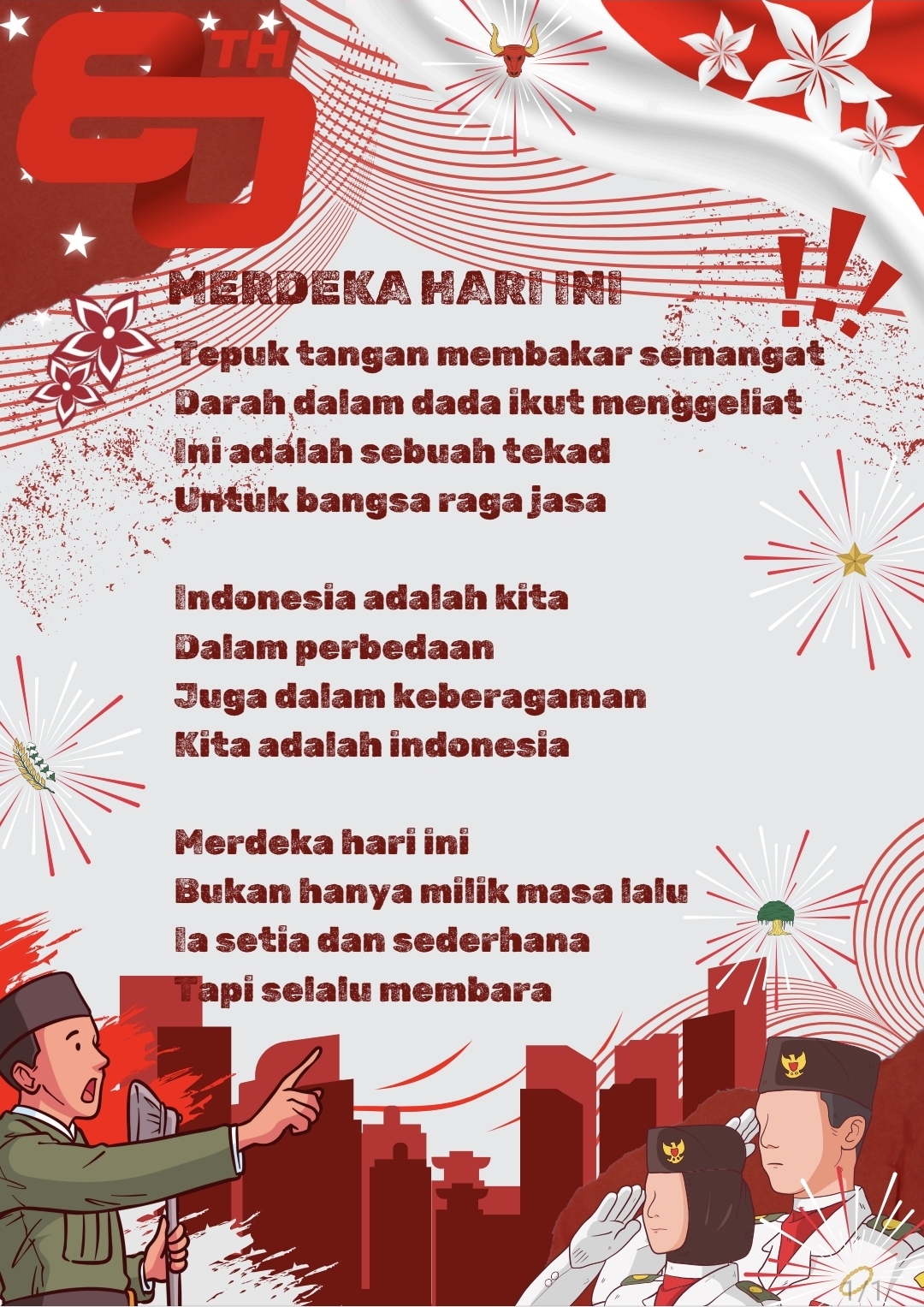 Deskripsi: Puisi tentang merdeka yang bukan hanya sekedar masa lalu, namun apapun hal yang kita lakukan sekarang adalah kemerdekaan. Indonesia merdeka dalam perbedaan dan keberagaman, serta dalam semangat yang meluap luap.