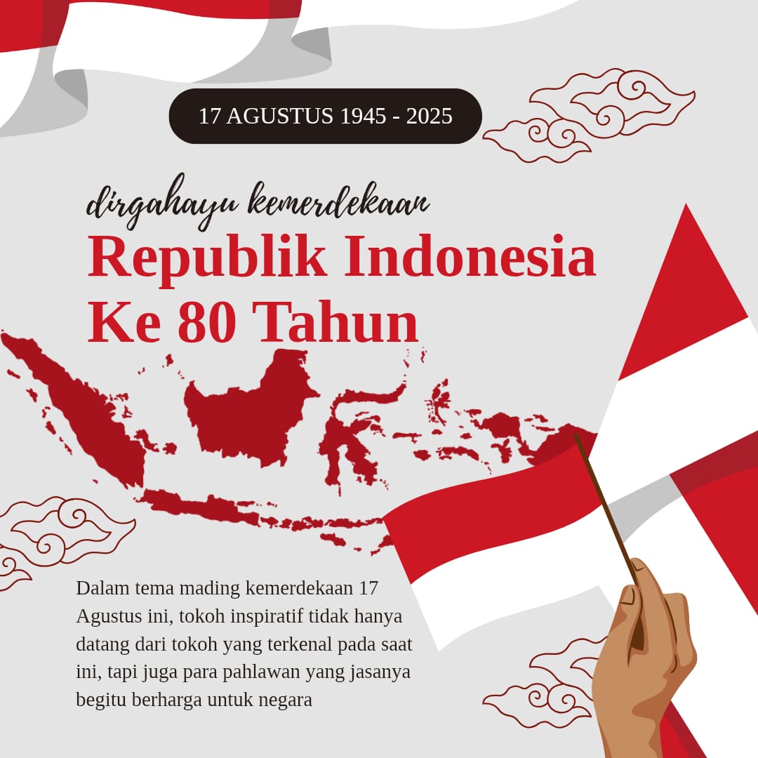 Di bagian atas terdapat tulisan “17 Agustus 1945 – 2025” yang menandakan usia kemerdekaan. Tulisan utama yang ditonjolkan adalah “Dirgahayu Kemerdekaan Republik Indonesia Ke 80 Tahun” dengan warna merah mencolok.