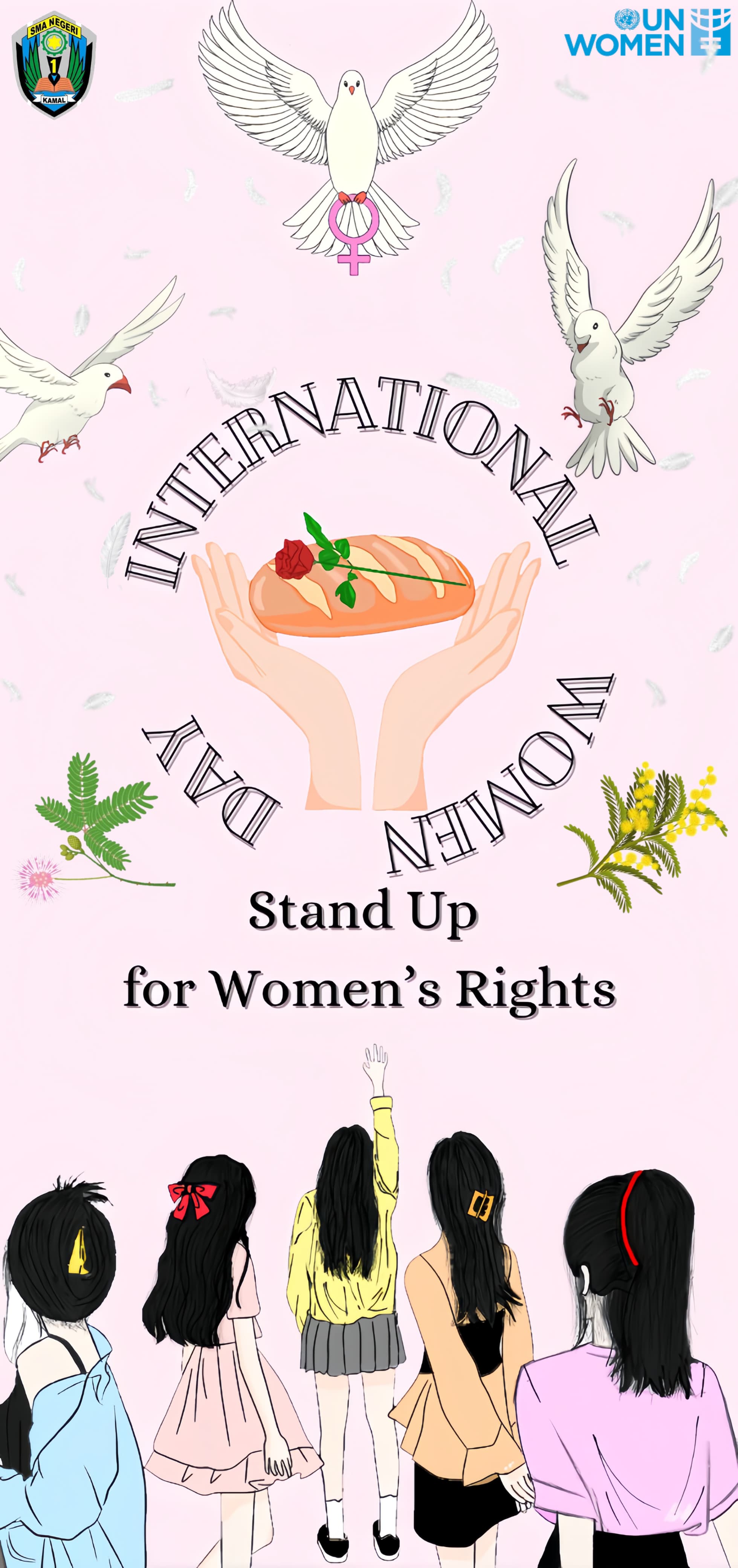 Deskripsi : Poster digital berukuran 9:16 dibuat untuk bertujuan agar perempuan bisa menjaga dan mempertahankan haknya. Poster ini menceritakan harapan, perjuangan sekaligus melindungi hak perempuan dengan menonjolkan "Rose and bread" dengan rose menggambarkan penghargaan, dan hak asasi manusia and bread menggambarkan kebutuhan dasar, background ungu menggambar martabat serta merpati yang melambangkan kebebasan, dan tangan yang seolah olah sedang berharap sekaligus melindungi hak-hak perempuan
