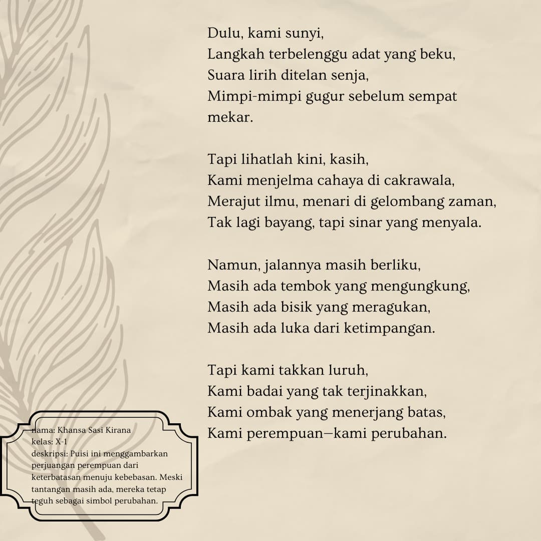 Deskripsi: Puisi ini menggambarkan perjuangan perempuan dari keterbatasan menuju kebebasan. Meski tantangan masih ada, mereka tetap teguh sebagai simbol perubahan.