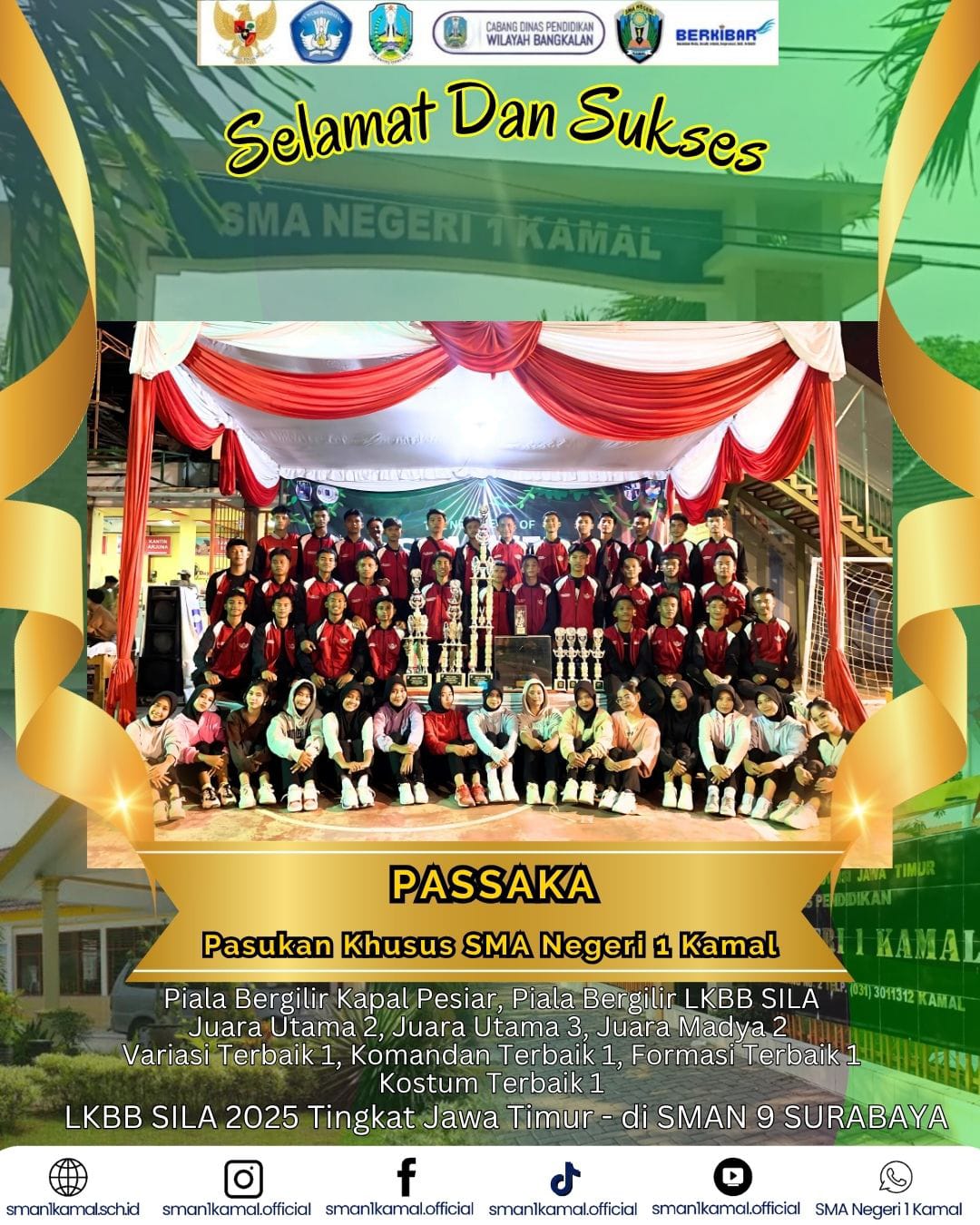 Pasukan Khusus SMA Negeri 1 Kamal (PASSAKA) berhasil meraih berbagai penghargaan dalam ajang LKBB SILA 2025 tingkat Jawa Timur di SMAN 9 Surabaya, termasuk juara utama, variasi terbaik, komandan terbaik, hingga kostum terbaik. Prestasi ini menjadi bukti kerja keras, kekompakan, dan dedikasi tim dalam mengharumkan nama sekolah.