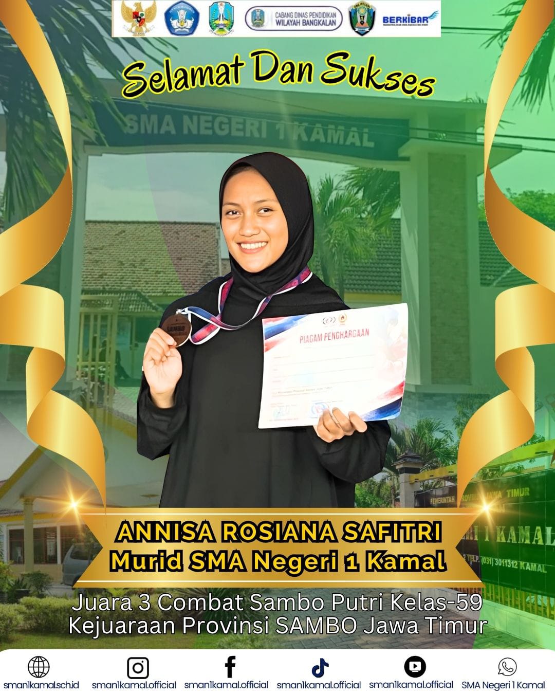 Annisa Rosiana Safitri, siswi SMA Negeri 1 Kamal, berhasil meraih Juara 3 dalam kategori Combat Sambo Putri kelas -59 kg pada Kejuaraan Provinsi SAMBO Jawa Timur. Prestasi ini menjadi bukti kerja keras dan dedikasinya dalam bidang olahraga.