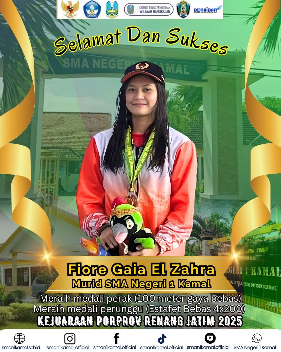 Fiore Gaia El Zahra, siswi SMA Negeri 1 Kamal, berhasil mengharumkan nama sekolah dengan meraih medali perak pada nomor 100 meter gaya bebas dan medali perunggu pada estafet bebas 4x200 dalam Kejuaraan Porprov Renang Jawa Timur 2025. Prestasi ini menjadi bukti kerja keras dan dedikasi yang luar biasa.
