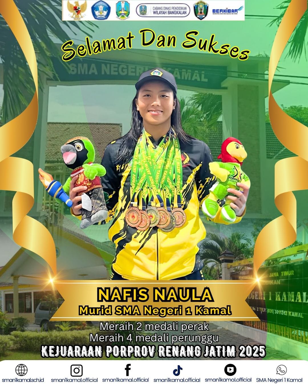 Selamat dan sukses kepada Nafis Naula, murid SMA Negeri 1 Kamal, atas prestasi luar biasa dalam Kejuaraan Porprov Renang Jawa Timur 2025 dengan meraih 2 medali perak dan 4 medali perunggu. Semoga prestasi ini menjadi inspirasi bagi seluruh siswa untuk terus berjuang dan berprestasi!