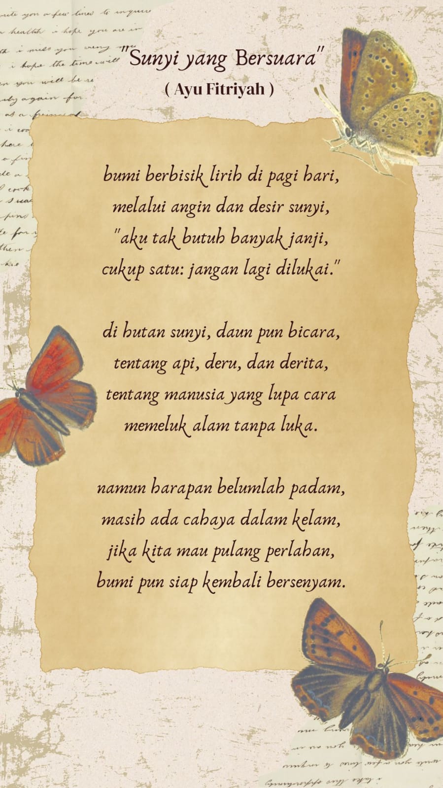 Deskripsi: Karya "Sunyi yang Bersuara" adalah puisi yang memancarkan keindahan bahasa dan makna mendalam. Dengan kata-kata yang lembut namun tajam, puisi ini menggambarkan dialog antara bumi dan manusia, mengisahkan tentang luka-luka yang telah terjadi dan harapan untuk pemulihan. Melalui metafora alam yang kuat, puisi ini mengajak pembaca untuk merenungkan hubungan harmonis antara manusia dan lingkungan, serta mengingatkan kita akan pentingnya menjaga dan memeluk alam dengan penuh kasih sayang. Pesan yang mendalam dalam puisi ini sangat relevan dengan kondisi lingkungan saat ini. Bagaimana menurutmu, puisi seperti ini bisa menjadi sarana efektif untuk meningkatkan kesadaran lingkungan?