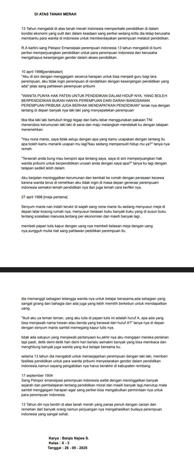 DESKRPSI:cerpen ini mengangkat kisah perjuangan R.A. Kartini, pelopor emansipasi perempuan Indonesia, yang selama 13 tahun mengabdi di atas tanah merah bumi pertiwi. dalam keterbatasan ekonomi dan budaya patriarki yang kuat, Kartini memperjuangkan hak perempuan pribumi untuk mendapat pendidikan. cerita ini menggambarkan semangat, keberanian, dan keteguhan hati kartini dalam menghadapi penolakan serta merintis sekolah bagi kaum perempuan, hingga akhir hayatnya di rembang. sebuah kisah inspiratif tentang harapan, keteguhan, dan mimpi yang hidup meski di tengah tantangan