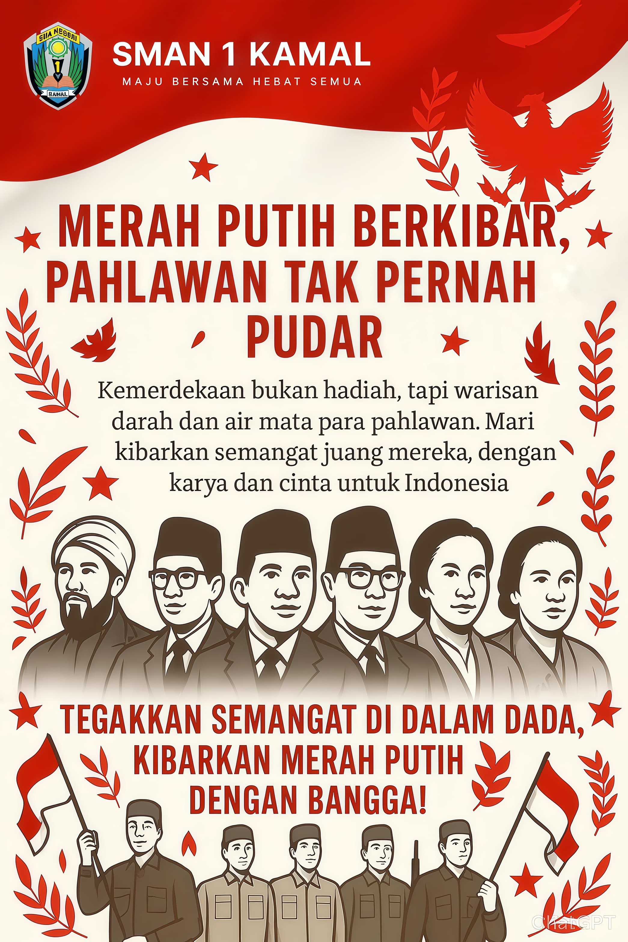 Deskripsi : Poster ini dibuat dalam rangka memperingati Hari Kemerdekaan Indonesia. Mengambil tema "Merah Putih Berkibar, Pahlawan Tak Pernah Pudar", poster ini menggambarkan semangat perjuangan para pahlawan nasional yang telah mengorbankan darah dan air mata demi kemerdekaan bangsa.