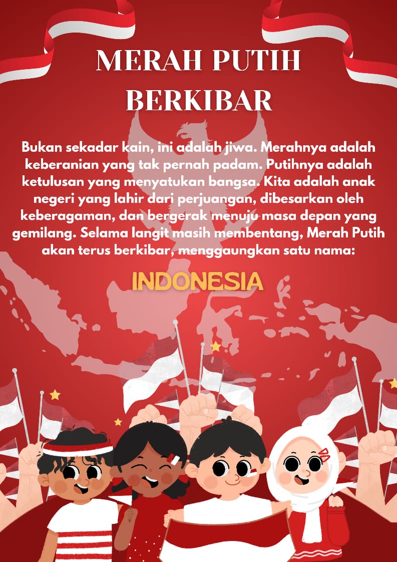 Deskripsi: Poster ini bermakna bahwa Merah Putih adalah jiwa bangsa Indonesia yang melambangkan keberanian dan ketulusan. Poster ini juga menekankan persatuan dalam keberagaman, sejarah perjuangan, dan optimisme untuk masa depan yang gemilang, dengan semangat nasionalisme yang akan selalu berkibar.